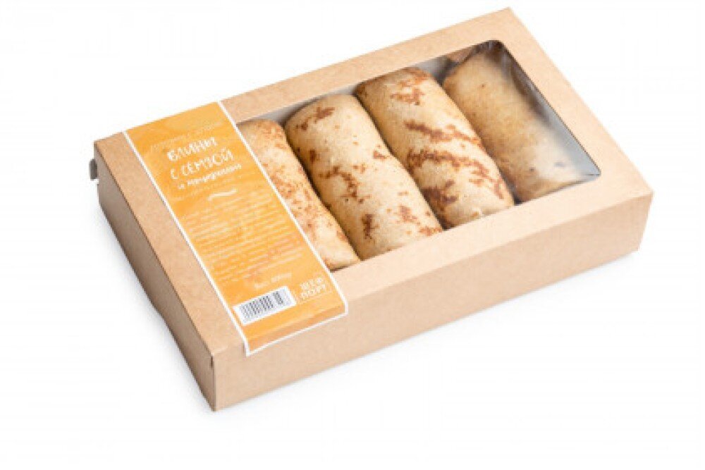 Состав: мука цельнозерновая, мука в/с, молоко, яйцо куриное, соль, масло растительное рафинированное дезодорированное, вода, фарш из рыб лососевых пород, сыр моцарелла, перец белый молотый.
