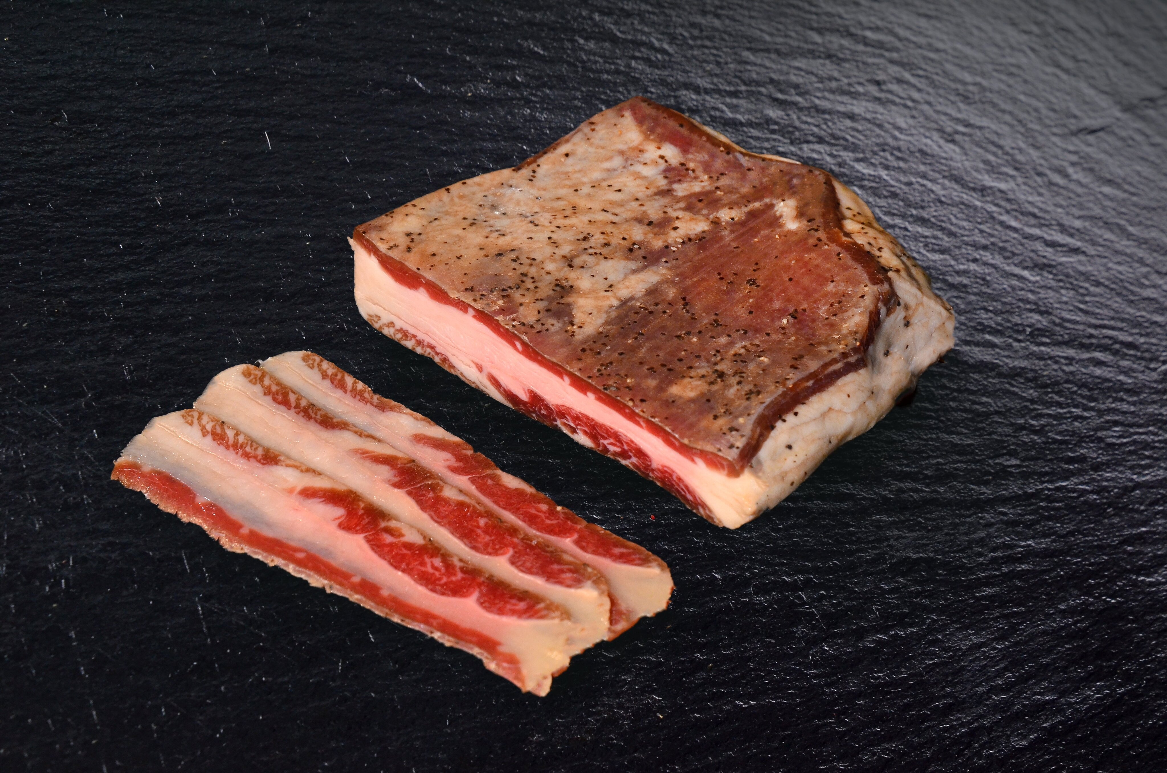 Состав: грудинка мраморная говяжья, соль пищевая, сахар, пищевая добавка рошинкен прошутто, пищевая добавка аромат салями, лимон, перец черный молотый.