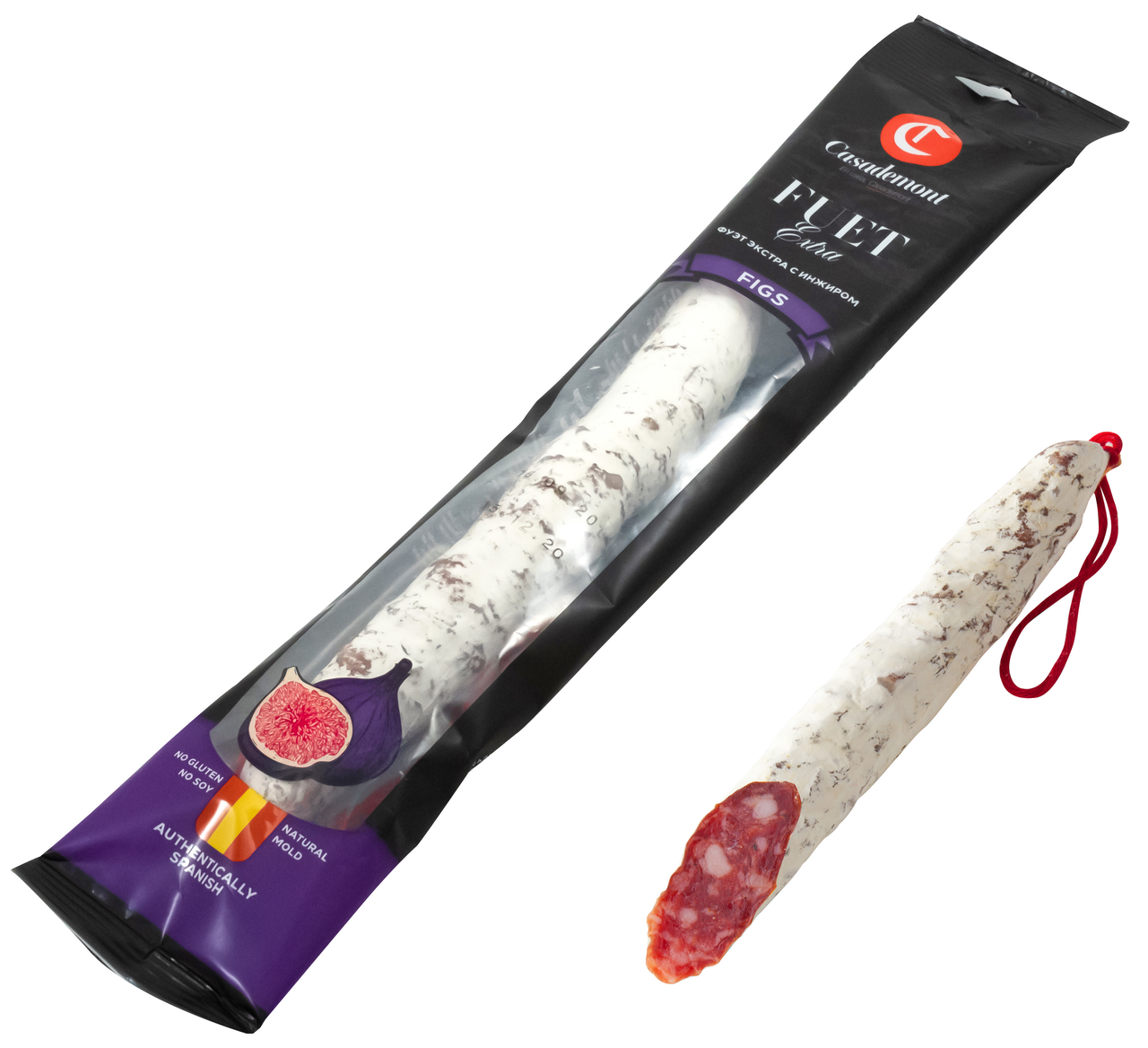Состав: свинина, шпик, лактоза, соль, декстроза, перец черный молотый, инжир сушеный, желатин, сахар, вода, ароматизатор, антиокислитель (изоаскорбат натрия), чеснок, краситель (кармины), консерванты (нитрат калия, нитрит натрия), стартовые культуры микроорганизмов
