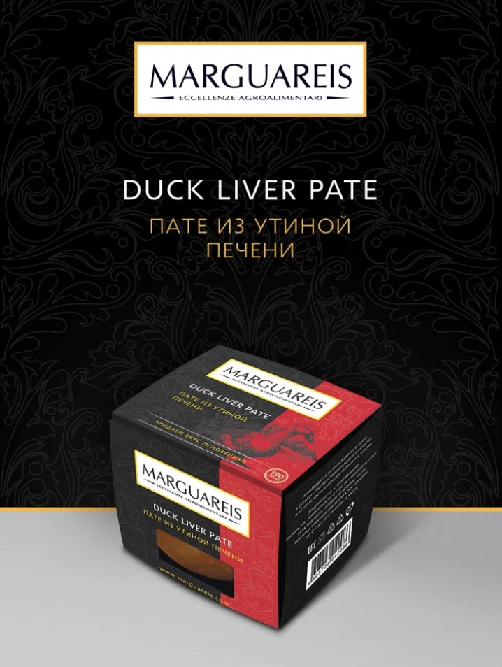 Состав: мясо и печень утки, коньяк, чернослив, сливочное масло, утиный жир, брусника, лук, морковь, соль, специи
