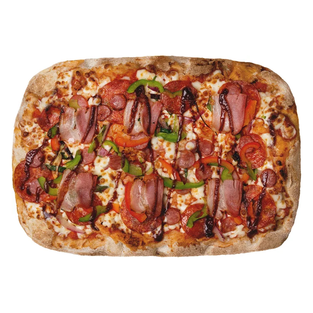Состав: основа для пиццы отпеченная, томатный соус, сыр с ЗМЖ, масло сливочное, белок молочный, перец болгарский, соус томатный барбекю классический, колбаски «Болгарские», экстракты из натуральных пряностей, бекон к/в из свинины, лук микс, изделие колбасное с/к колбаса п/с пепперони, колбасное изделие с/к колбаса п/с чоризо.