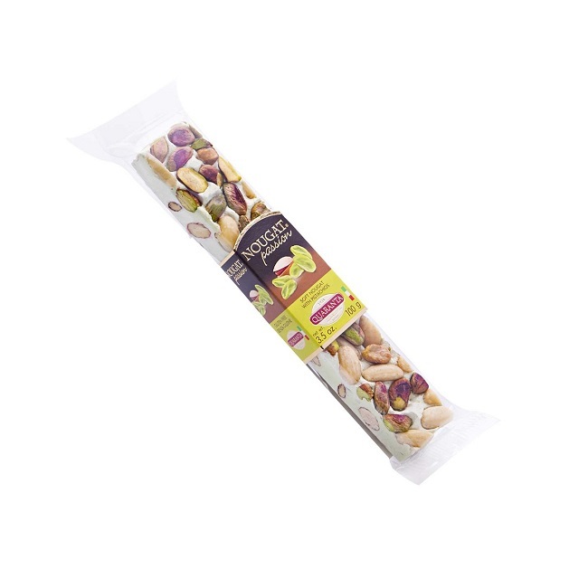Состав: Торроне мягкий фисташковый: сахар, миндаль, сироп глюкозы, мед, фундук, фисташки 6%, кукурузный крахмал, яичный белок, облатка (картофельный крахмал, вода), концентрат спирулины и сафлора, ароматизаторы.